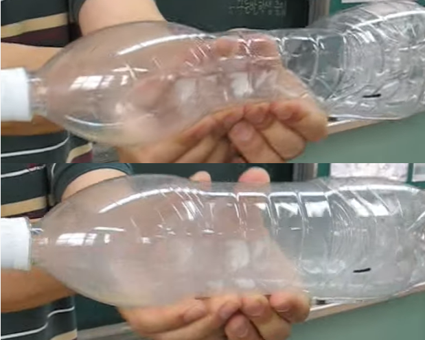 아마도 페트병을 눌렀을때 처음보다 온도가 올라가 페트병 안이 불포화 상태가 되어