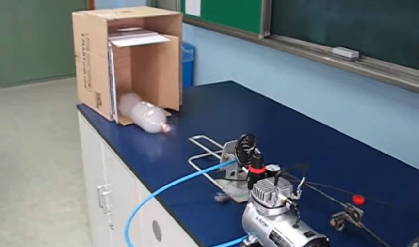 이때 페트병 앞쪽에 빈박스 2개를 충분한 공간을 두고 설치하여 발사충격을 흡수하도록 한다.