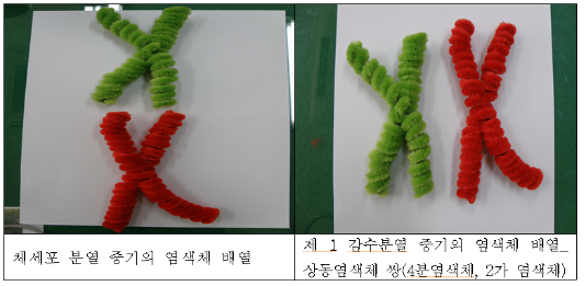 1. 염색사, 염색체, 상동염색체, 2가 염색체의 개념을 설명한 후, 모루끈으로 각각의 모형을 만들어 보도록 한다. 상동염색체와 2가 염색체에 대해서는 학생들이 어려워하고 오개념도 많이 가지고 있다. 어떻게 만들어야 할지 토의해 보도록 한다.