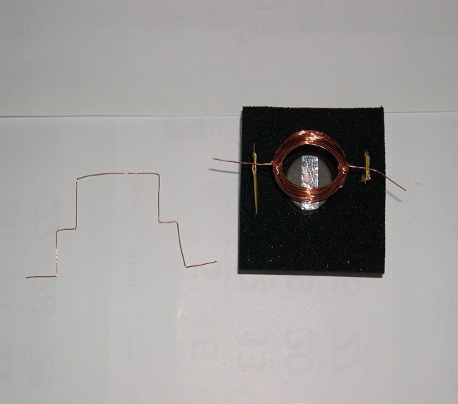 5) 이 유도 전류는 꼬마 전구를 납땜한 원형 코일을 철심 둘레에 놓아 전구에 불이 켜짐으로서 알 수 있습니다.