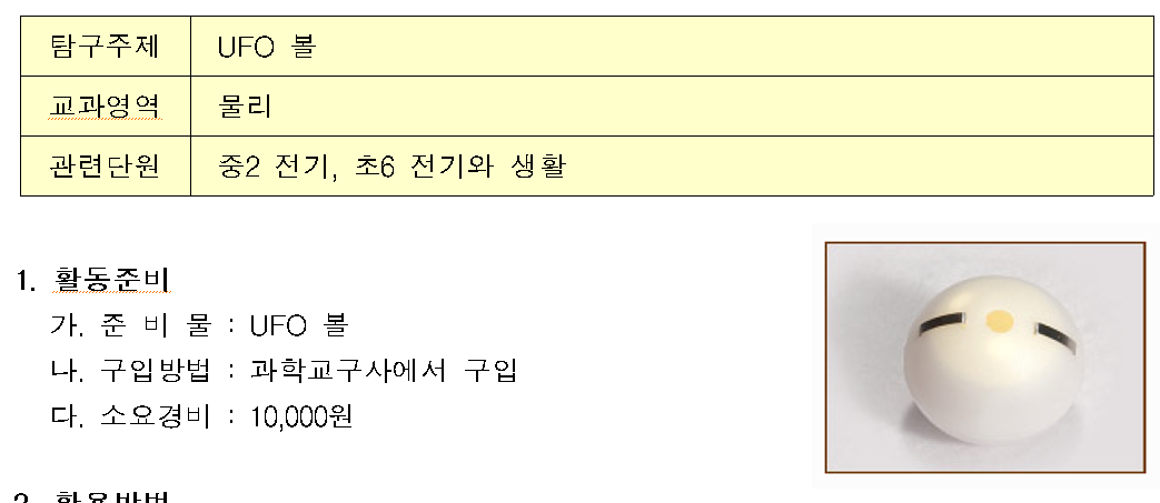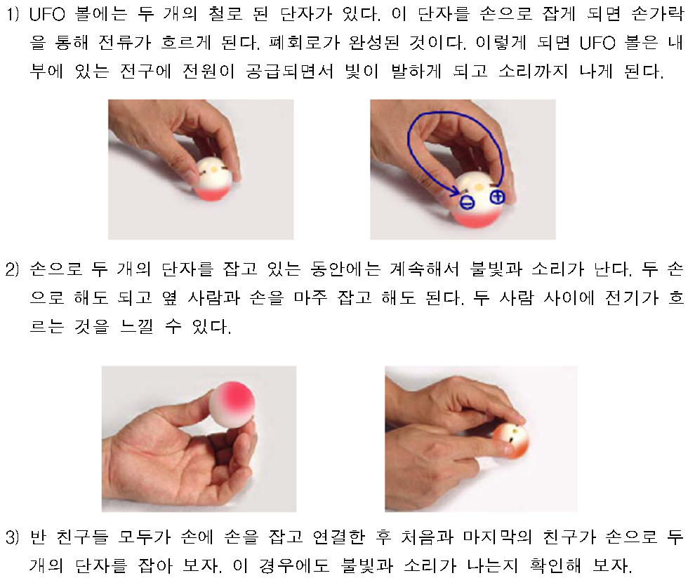 가. UFO 볼 : 볼 내부에 전원이 있어 폐회로가 만들어지면 환상적인 불빛과 소리가 나서 전류가 흐른다는 것을 확인해 볼 수 있는 완구이다.
