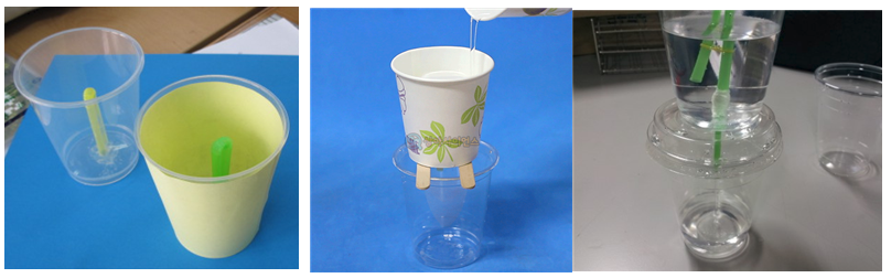 1. 완성된 컵에 물을 부어가며 언제 물이 나오는지 실험한다.