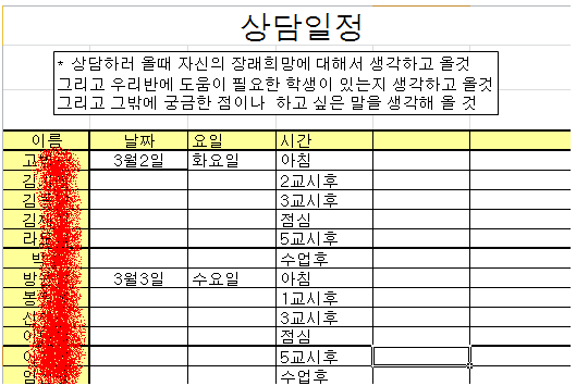 그리고 엑셀에 명렬표를 만들고 학생들 상담하러 오는 쉬는시간을 다 배정해 주고 게시판에 게시하였습니다.