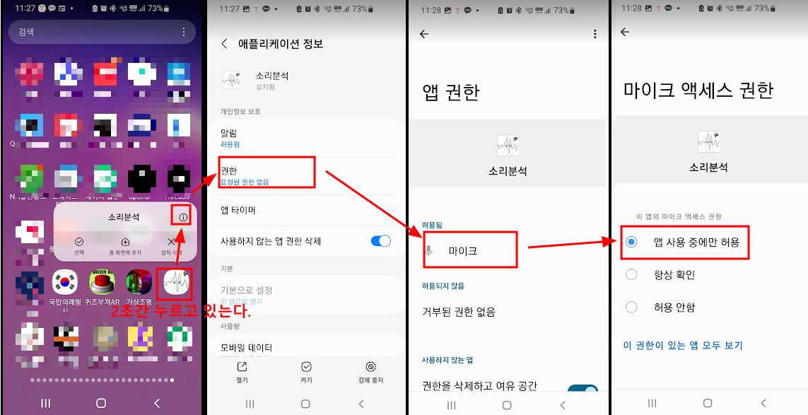 권한 설정은 소리분석프로그램 아이콘을 꾹 누르고 있으면 나오는 앱정보에 가서 권한에 가면 있다.