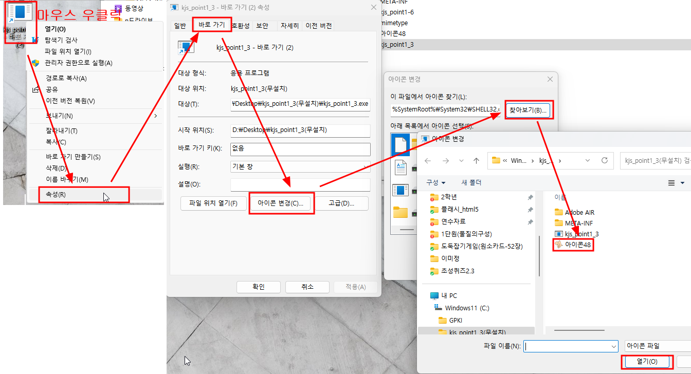 kjs_point1_3 실행화일을 마우스 우클릭 해서 보내기 바탕화면에 바로 가기 만들기를 눌러 바탕화면에 바로가기를 만든다. (바로가기 에서만 아이콘을 설정할 수 있다. 실행파일에서는 아이콘 설정이 안된다)