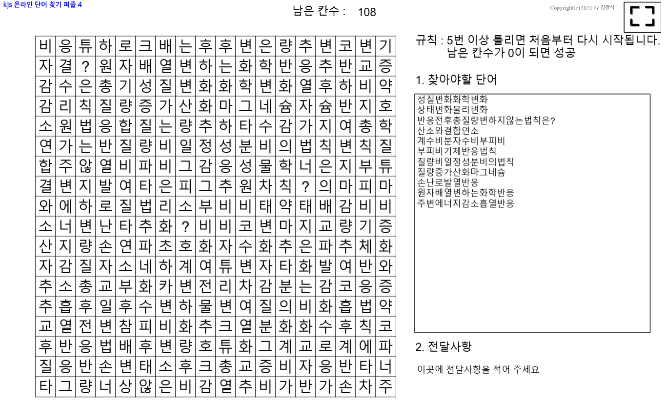 단어찾기퍼즐(화학반응의 규칙) - 온라인학습 과제용-웹이나스마트폰에서 직접