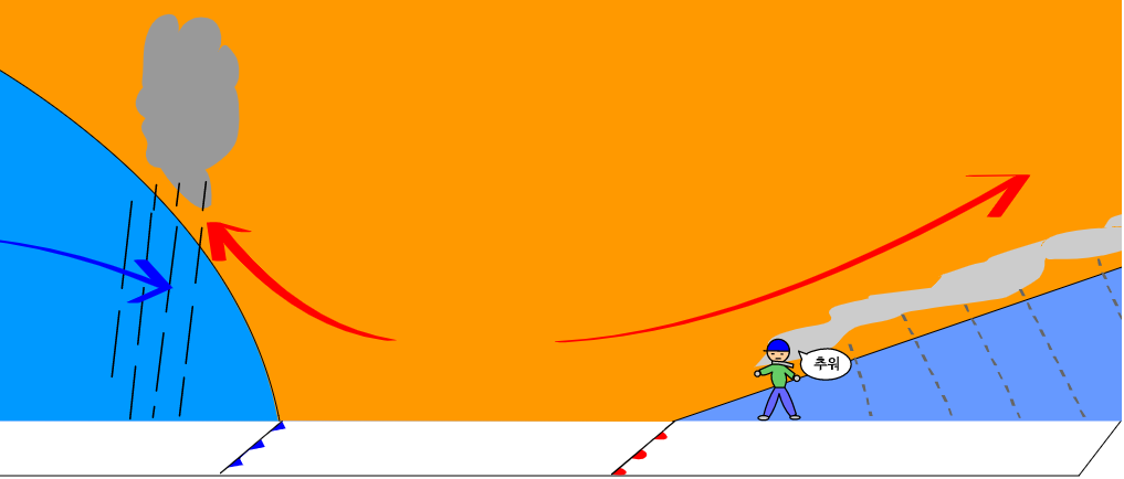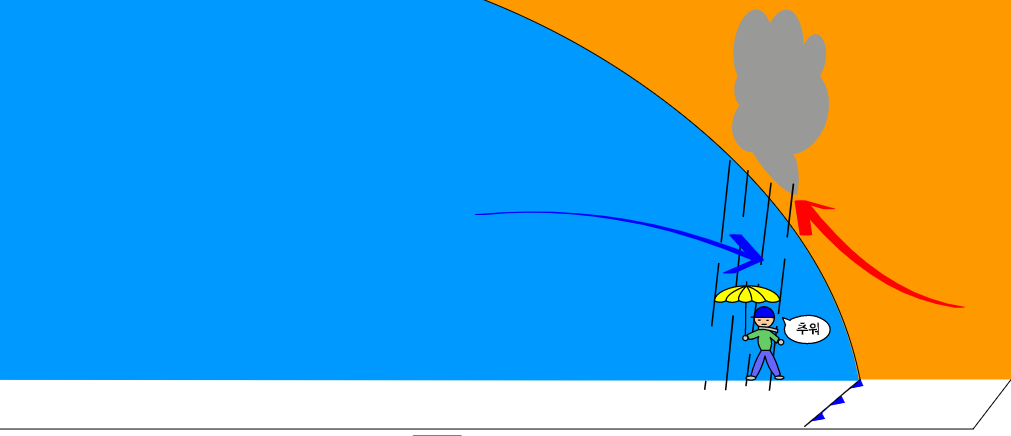 (사실 차가운 공기끼리 만나도, 차가운 정도가 다르면, 또다시 바닥면에 전선이 만들어지기도 한다. 요건 생략)