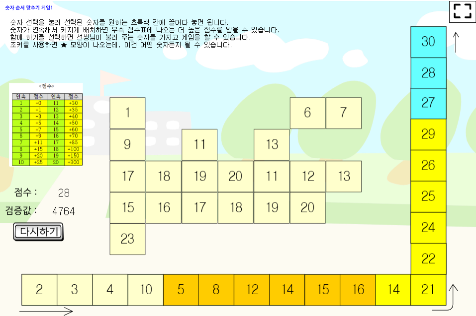 보드게임 중에 스트림스(streams)라는 오름차순 게임이 있다. 이 게임을 모방해서 숫자 순서 맞추기 게임을 만들어 보았다.