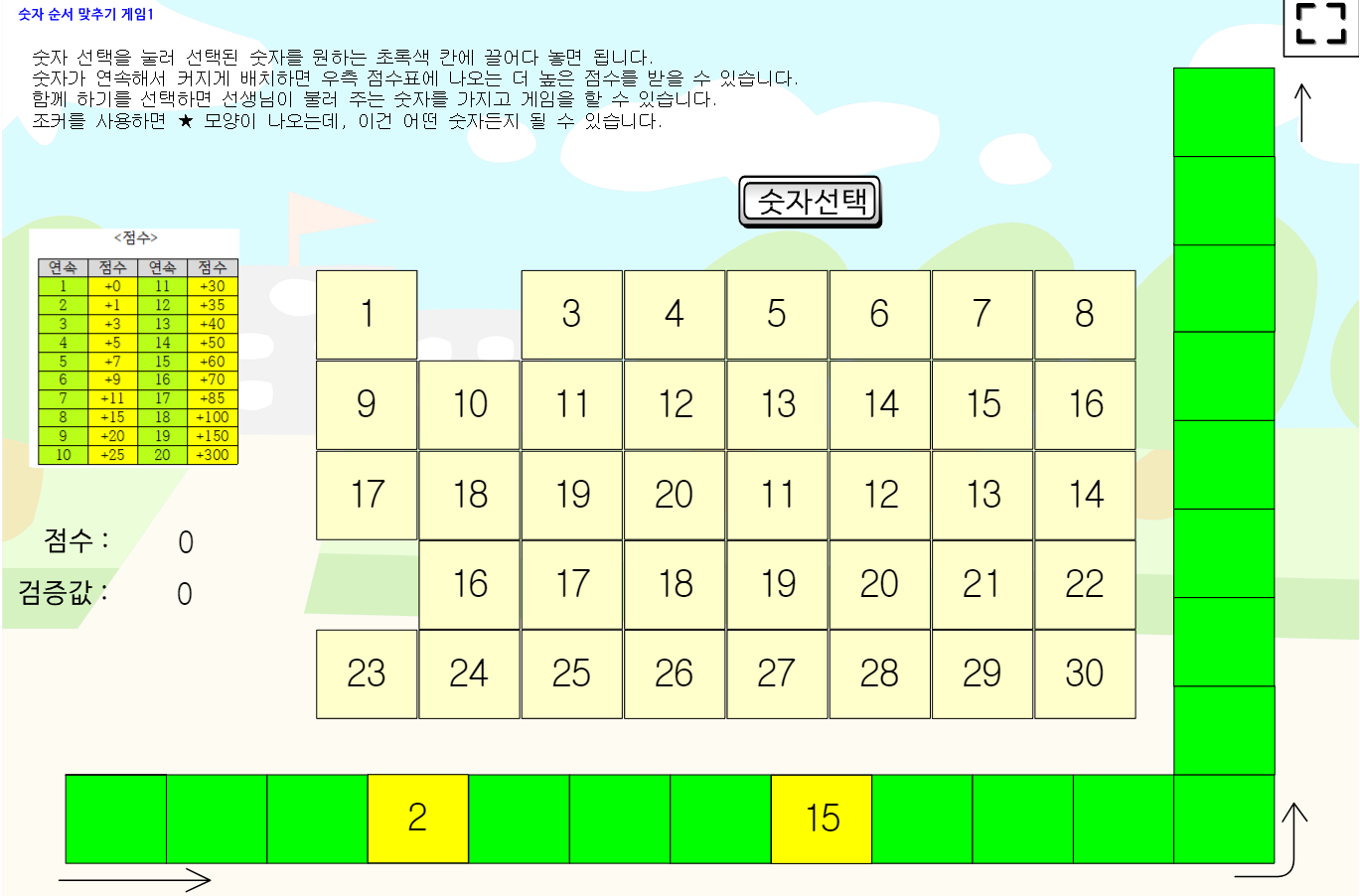 2. 교사가 불러주거나 컴퓨터가 숫자 선택을 눌러 나온 임의의 숫자를 녹색칸 중에 원하는 곳에 올려 놓는다.
