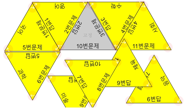 그럼 학생들은 학생용 삼각형 퍼즐을 실행시킨 다음, 선생님이 주신 암호화 된 문제를 복사해서 첫화면에 붙여 넣기 하고, 바로 삼각형 웹퍼즐을 활용할 수 있다. 모든 문제와 정답이 맞는 면끼리 일치 시켜야 한다. 간단한 단답형 문제를 새롭게 푸는 방법이다. 단답형 문제를 그냥 출제 하는 것보다 학습 효과가 크다.