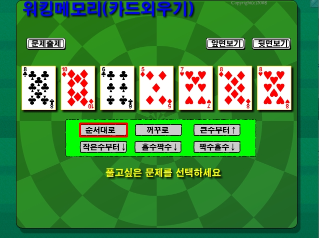 게임을 시작하고 문제출제 버튼을 눌러 문제를 출제하면 됩니다. 아래 설명중 카드놀이 설명을 참고하세요 문제선택중 홀수짝수 는 숫자가 작은 것부터 홀수를 다 선택한후 숫자가 작은것부터 짝수를 순서대로 선택해야 합니다. <조금 어렵겠지요> ![]() -----아래는 스펀지2.0 에 나온 내용입니다. ----------- 【공부 잘하는 법 1탄】 ▶ 잠자는 워킹메모리를 깨워라!! - 전두엽은 우리 몸의 CEO역할을 담당하는 곳으로 기억력과 사고력을 관장하며 행동이나 감정을 제어하고 사람들과의 커뮤니케이션을 담당하는 기관이다. - 워킹메모리란(working memory)? 한번 들었던 이야기를 머릿속에 그대로 유지해 놓고, 그 이야기를 띄어놓은 상태에서 한 번 더 조작을 가해서 어떤 문제를 해결할 수 있도록 하는 것이다. ▶ 워킹메모리 향상을 위한 비법은? - 카드놀이입니다!! 워킹메모리는 머릿속에 내용을 띄워놓고 그것을 가지고 한 번 더 조작을 가해서 문제를 해결하는 것이다. 카드를 가지고 바로 이 작업을 할 수 있습니다. 아래의 설명대로 엽습하시면, 여러분의 잠자는 워킹메모리를 깨울 수 있습니다!! 1) 무작위로 섞인 카드에서 7장의 카드를 선택한다. 2) 집중해서 30초 동안 숫자를 외운다. 3) 시간이 지나면 카드의 뒷면이 보이도록 일제히 뒤집는다. 4) 외웠던 순서와 반대로 방향으로 소리를 내어 숫자를 말하면서 확인한다. TIP) 거꾸로 외우기가 잘 되시는 분들은 카드의 숫자와 그림을 함께 외우기 높은 수부터 재배열, 낮은 수부터 재배열, 홀수 짝수로 나누기 등 점점 난이도를 높여가면서 연습하시면 됩니다. 카드놀이를 꾸준히 연습해서 잠자는 워킹메모리를 깨워, 앞으로 효율적인 학습에 도움이 되었으면 합니다!! |