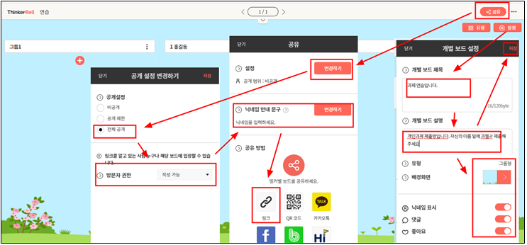 4. 학생들이 들어와 쓸 수 있도록 공유설정도 해 주어야 한다. 보통 전체공개 방문자 권한 작성가능으로 해서 학생들이 링크를 타고 들어와서 사용할 수 있게 만들어 주면 된다.