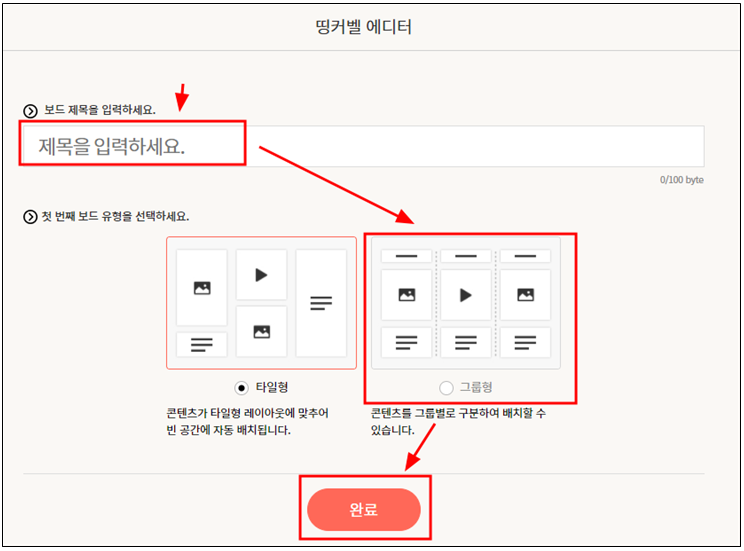 제목을 입력하고 유형을 선택한 다음 완료를 누르면 띵커 보드가 만들어 진다.