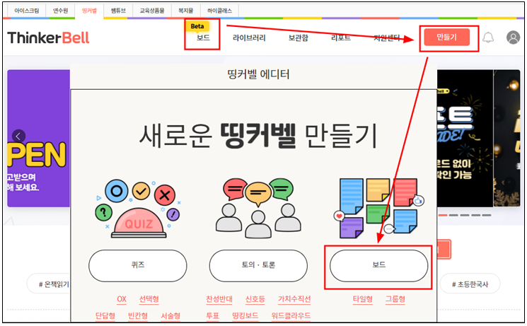 실시간 퀴즈를 할 수 있는 띵커벨에서 띵커보드를 새로 만들어 출시했다.