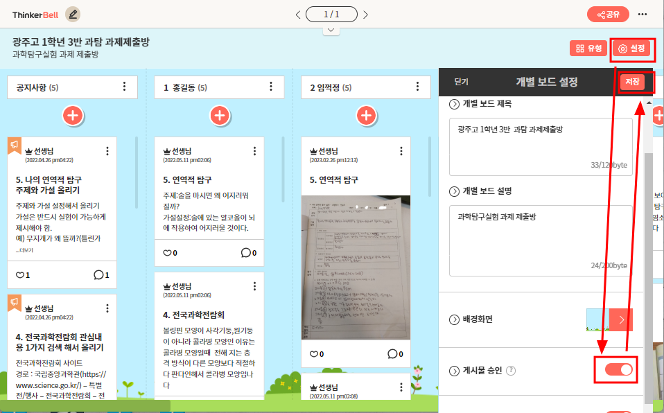 9. 설정에서 학생들이 올린 게시물이 바로 보이지 않고, 선생님이 승인해야만 보게 할 수 있다. 설정에서 게시물 승인에 체크해 주면 된다. 그럼 학생들은 게시물을 작성할 수는 있지만 다른 친구들에게는 보이지 않는다.