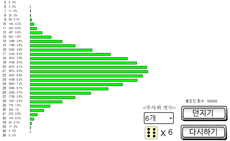 몇번을 던지면 합계가 36이 나올지 도전해 보자.