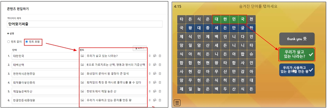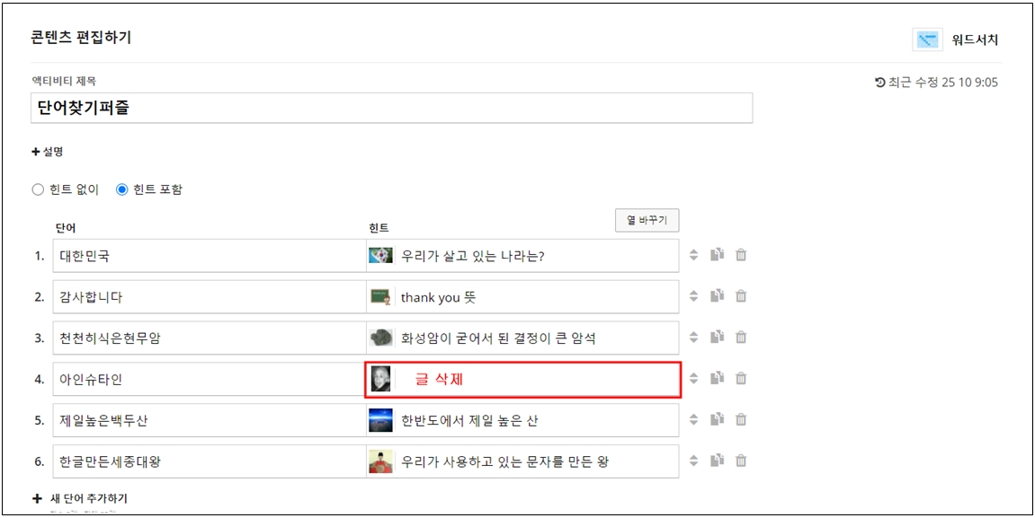 콘텐츠 편집하기에 들어가서 힌트 포함을 선택하면 단어 우측에 힌트창이 나타난다. 그곳에 힌트 또는 문제를 추가로 입력하고 문제를 만들면 된다.
