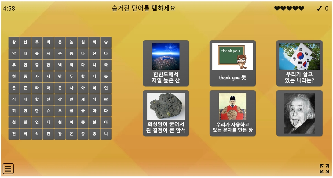그럼 단어찾기 퍼즐을 실행했을 때 우측 그림처럼 힌트(문제)가 우측에 나타나고 그 문제의 답을 단어찾기 퍼즐에서 찾아야 한다. 단어를 찾고 우측에 힌트와 제대로 연결해야 점수가 올라 간다.