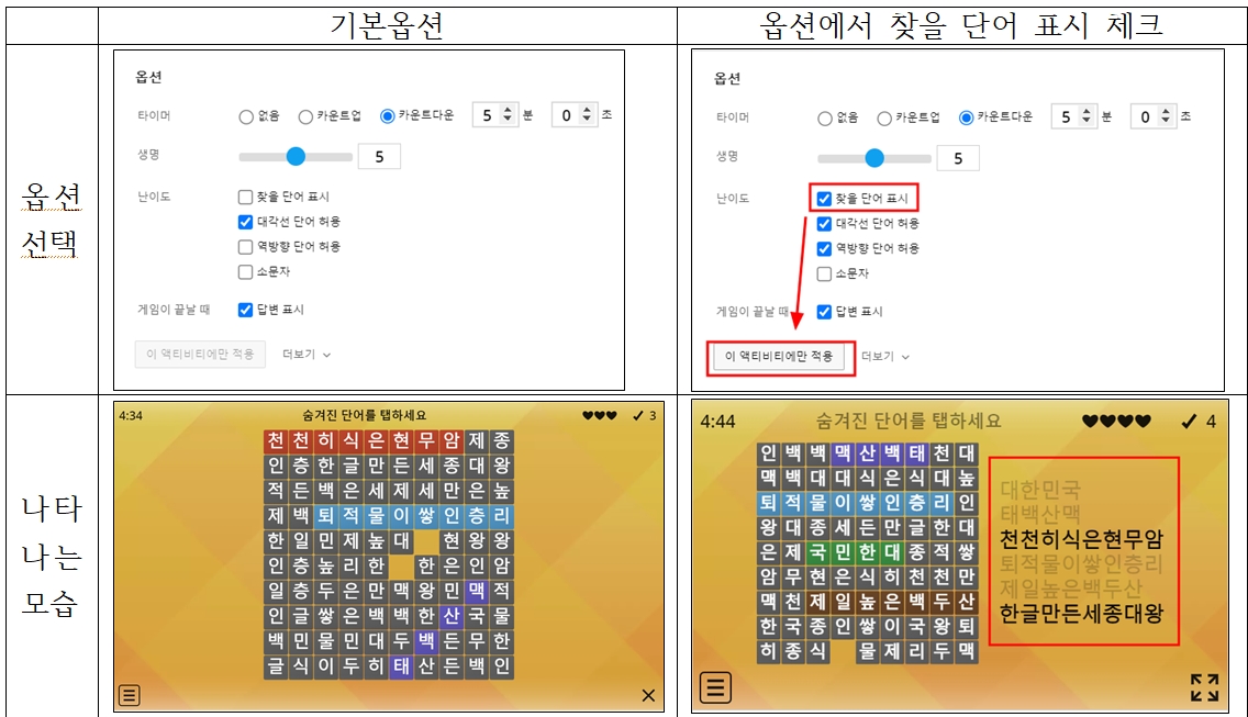 이때 학습적인 효과를 보기 위해서는 내용과 단어가 함께 제시되면 좋다. 단어찾기 퍼즐을 수업에 효과적으로 활용하는 방법(오프라인에서 출력해서 사용하는 방법 포함)은 아래 링크 참고