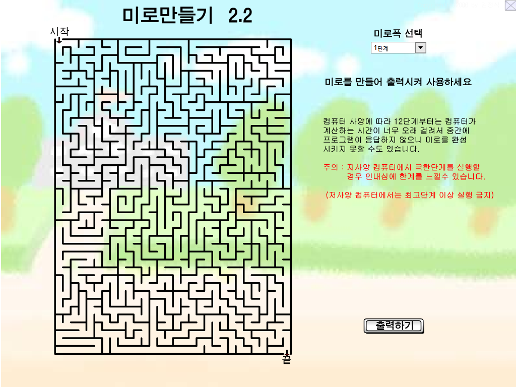 | 미로만들기2.2 입니다. <2.2 업그레이드 된점> 1. 제작 속도 개선 2. 완성되어 가는 미로를 볼 수 있도록 개선(이전에 나오던 에러메세지 안나옴) 3. 미로제작단계 3단계 더 추가(더 복잡한 미로를 만들 수 있으나 - 저사양에서는 권장하지 않음) <2.0 업그레이드 된점> 1. 미로 만들기1.0 이 미로를 생성하고 나면 너무 쉽게 만들어져서 아이들이 너무 쉽게 찾아가므로 어렵게 만들어 지도록 수정(난이도가 상당히 높아졌습니다.) 2. 미로를 만들때 선의 두께를 얇게 하여, 출력하거나 복사할때 잉크를 절약할 수 있도록 수정 <특징> 프로그램을 실행하면 자동으로 미로를 만들어 줍니다. 오른쪽에 있는 메뉴에서 미로폭을 바꿀 수 있습니다. 자습시간이나 자치적응시간에 간단하게 미로를 만들어 출력해서 사용할 수 있습니다. * 종례신문의 한쪽 구석을 미로로 채우면 어떨지... * (화면캡쳐해서 써야함) |