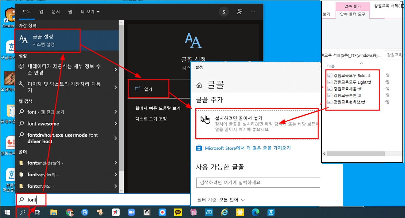 3. 설정에서 글꼴 설정을 열고 글꼴 추가에 폰트를 끌어다 놓으면 자동으로 설치 됩니다.