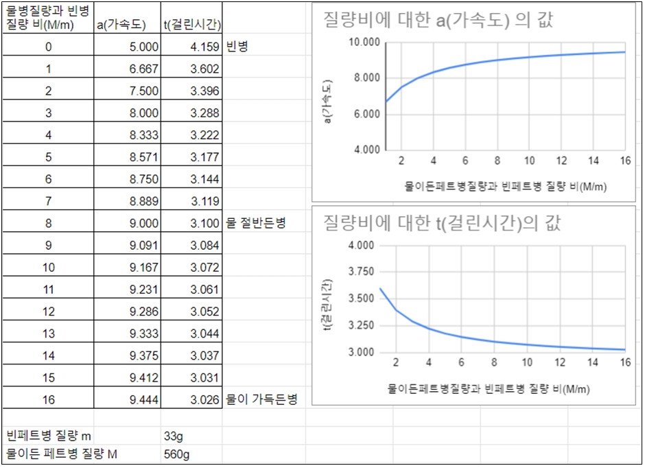 물이 든 병의 질량을 M 이라 놓고, 빈병 질량을 m 이라고 놓았을 때 상대적인 질량비(M/m)에 따라 바닥면에 도달하는 시간이 달라진다.