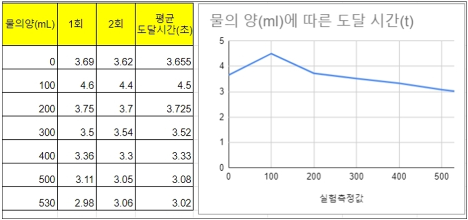 물의 양을 조금씩 변화시켜가며 책상 끝에 도달하는 시간을 측정해서 기록하고 그래프를 그리게 하자.