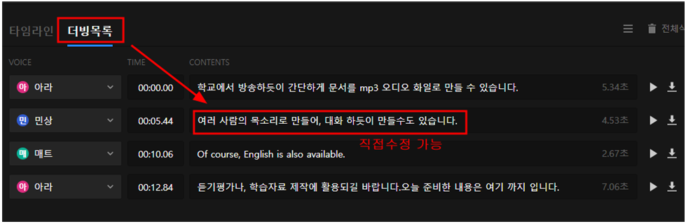 4. 글자를 수정하고 싶을 때는 더빙목록을 누르면, 기존에 적어 놓은 글들이 뜨는데 그곳에서 삭제하거나 직접 수정 할 수 있다.