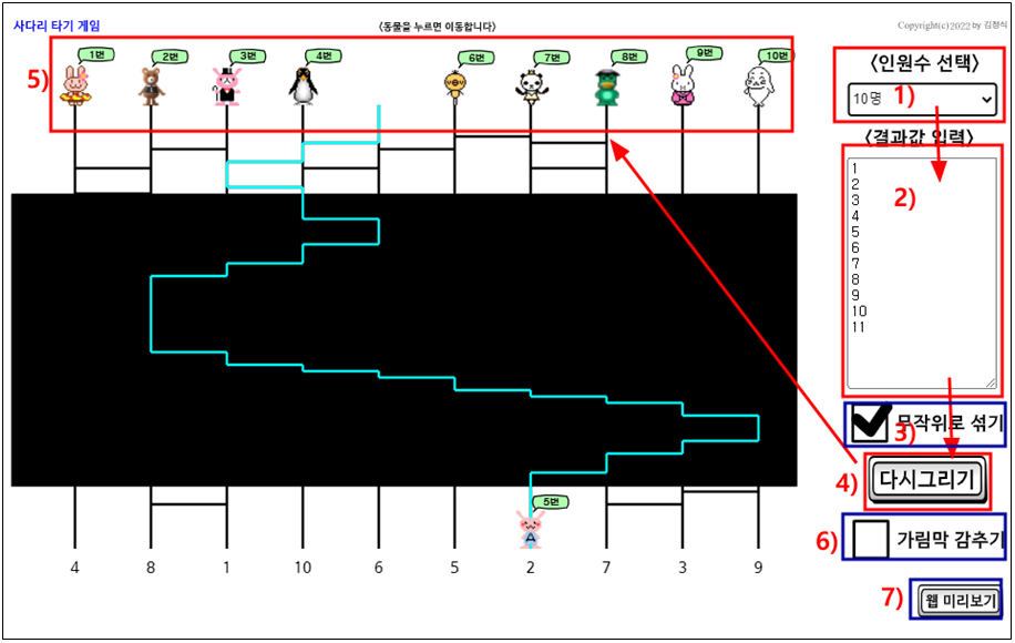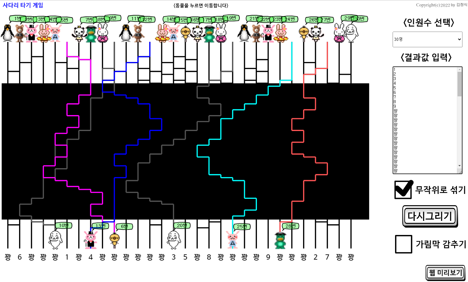 6) 다시 그리기를 하면 자동으로 중간에 검은색 가림막이 나타난다. 이는 학생들이 동물을 고를 때 미리 예측하지 못하게 하기 위함이다. 가림막 감추기에 체크 하면 가림막이 사라지며 사다리 타기 전체 모습을 볼 수 있다.