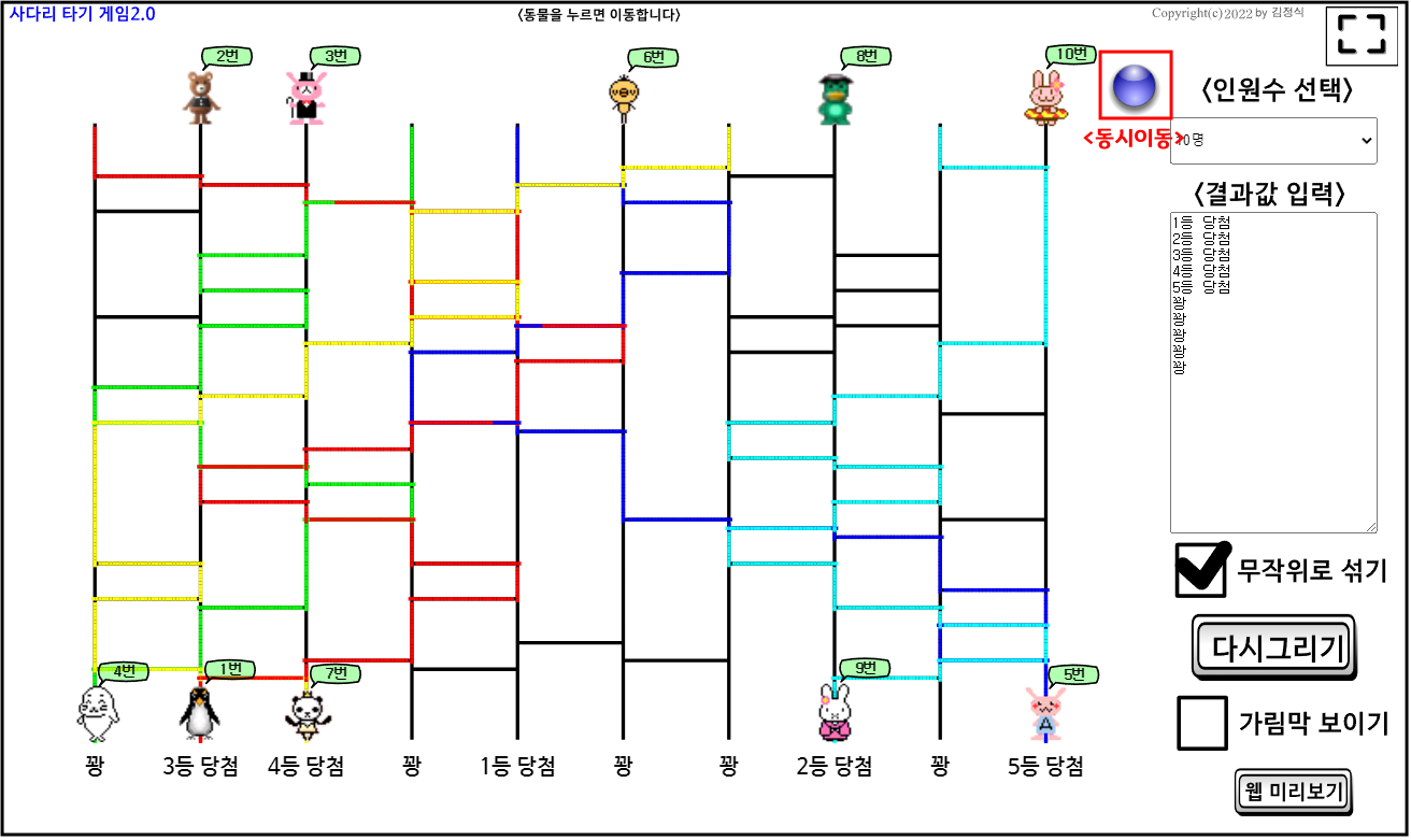 <2024.08.01 추가> 사다리타기 2.0으로 업데이트 하면서 말들의 움직임을 부드럽게 움직이도록 수정했고, 한개의 말이 움직일 때 다른 말들도 움직일 수 있도록 수정했다. 그리고 모든 말들이 동시에 움직이는 버튼도 추가했다. 인원수 선택 옆에 동그라미를 누르면 모든 말들이 동시에 움직인다.