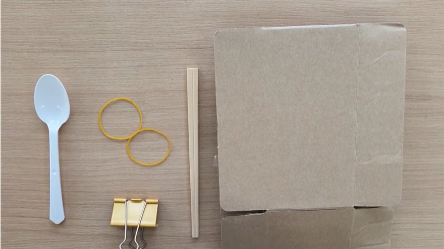 4.택배박스 한쪽면을 접어서 틀을 만들고, 열려 있는 쪽에 숟가락이 연결된 나무젓가락을 끼워 넣는다. 끝까지 넣어야 발사시 흔들리지 않고 고정이 된다. 필요하면 테이프를 이용하여 고정시켜도 좋다.