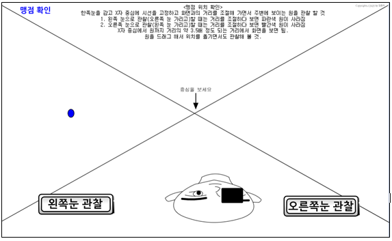1. 왼쪽 눈으로 관찰(오른쪽 눈 가리고)할 때는 X자 중심에 초점을 맞추고, 거리를 조절하다 보면 왼쪽에 있는 파란색 원이 사라짐
