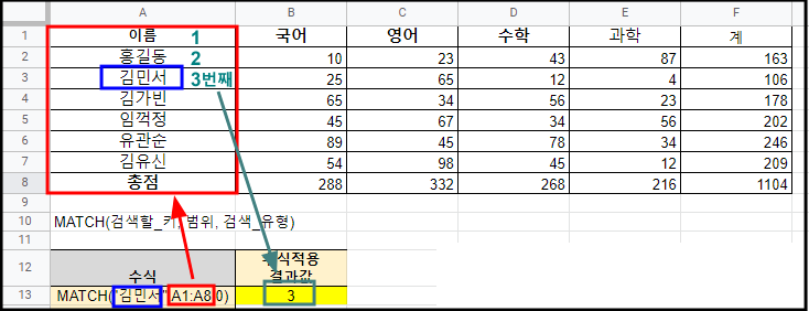 A1:A8 범위(즉 이름이 있는 범위)에서 '김민서' 이름이 정확히 일치하는 셀을, A1셀로 부터 몇번째 위치에 있는지를 숫자로 반환(A1셀 부터 숫자를 셈)