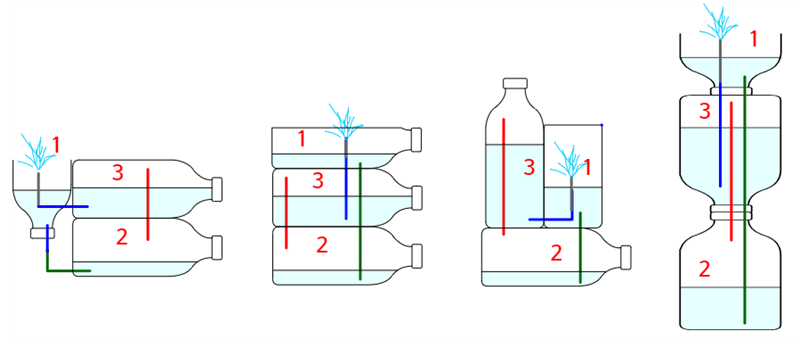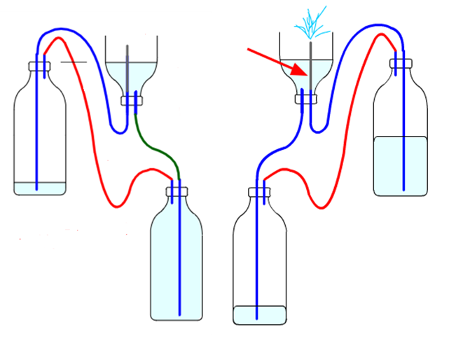 1번 분수에 물을 부으면, 수압차에 의해 1번 분수에 있던 물이 2번 페트병으로 흘러 내려간다. 그럼 2번 병에 있는 공기가 압력이 커져서 적색 연결관을 따라 3번 페트병으로 이동하게 된다. 3번 페트병에 공기가 이동해 오면 기압이 커지게 되고, 증가된 기압은 3번 페트병에 있는 물을 파란색관을 통해 1번 분수관으로 밀어올리게 된다. 그럼 1번 분수에서 물이 나온다. 뿜어져 나와 고인물은 다시 2번 페트병으로 흘러 내려가면서 같은 작용이 반복되면서 계속해서 분수가 나오게 된다.