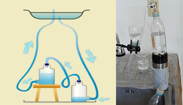 6. 왼쪽 페트병에 물을 채우고 오른쪽 페트병 보다 높은 곳에 위치 시킨다. 그리고 뒤집어 진 페트병에 물을 약간 부어주면 물이 순환하면서 분수가 나온다. 위쪽 병에 물이 다 사라지면 더 이상 분수는 작동하지 않는다. 그럼 아래쪽 병에 있는 물을 다시 위쪽병으로 옮겨주면 또 다시 작동하게 할 수 있다.