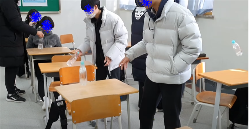 만약 병을 회전시키지 않고, 제자리에서 떨어뜨려서 세울 수 있을까? 학생들에게 한 뼘 높이에서 병을 떨어뜨려 세워 보도록 했다. (그냥 떨어뜨려서 세우는 시도는 지금까지 본 적이 없다. 그냥 떨어뜨려 세우면 회전시켜야 하는 이유를 알 수 있다)