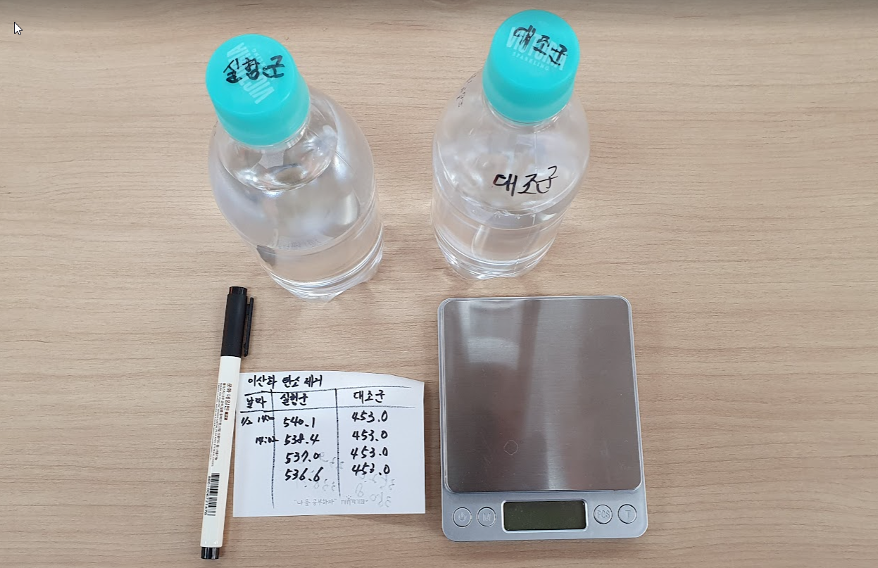 첫번째는 탄산수를 절반만 남기고, 하나는 압력을 넣은채로, 하나는 그냥 뚜겅만 닫은채로 하루동안 놓아 둔 후 질량을 측정해 봤는데 감소한 질량이 0.4g 으로 거의 똑같다.