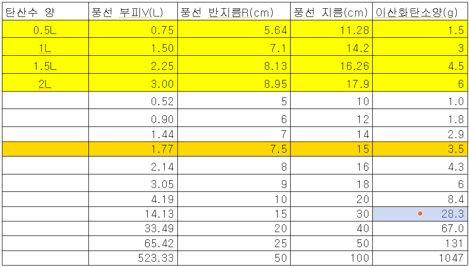 탄산수 3기압에서 1기압으로 감소시켰을 때(2기압 차이) 용해도 차이로 빠져 나올 수 있는 이산화탄소 기체의 최대 부피(풍선 부피)와 풍선 지름과의 관계를 계산해 놓았다. 아래표는 2기압 차이가 날때 빠져나온 이산화탄소 양을 계산해 논 표이다.