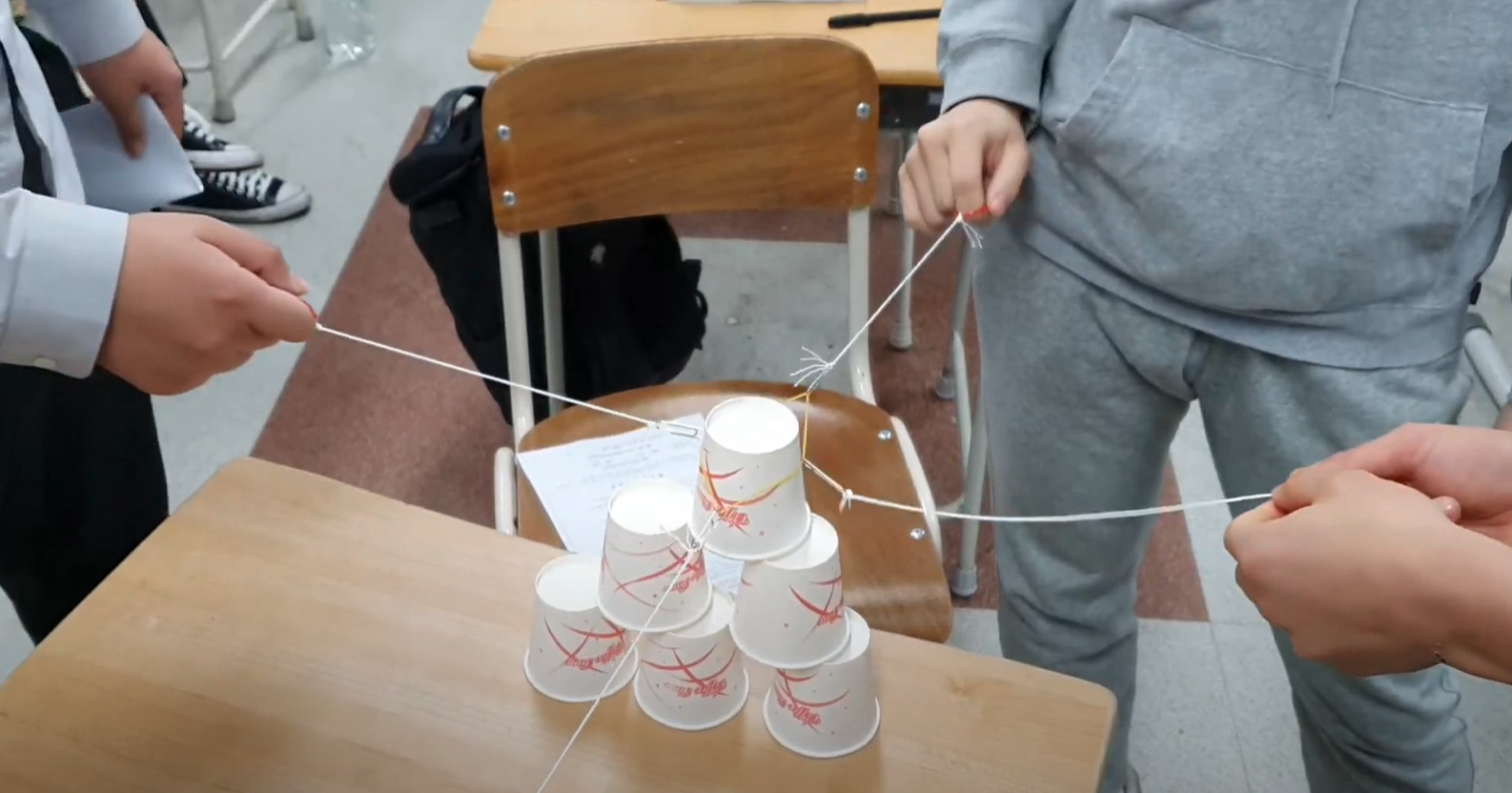 두 명의 학생이 줄 1개씩 잡고 서로 자신의 방향으로 잡아당기면서 컵 쌓기에 도전하면 된다.