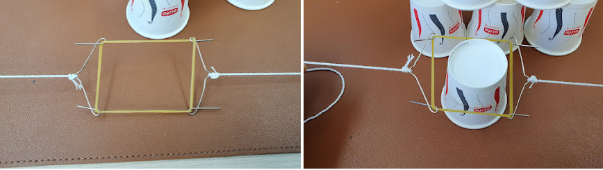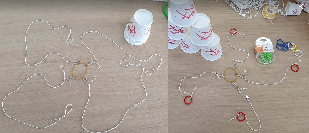 클립을 펴서 받침을 만든 다음 고무줄에 걸고 실을 연결한다. 그럼 2명이 컵 쌓기가 가능하다. 종이컵은 소주잔 크기의 컵을 사용하도록 했다.