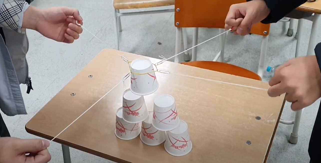 협력하여 고무줄로 종이컵 쌓기 (힘의 합력과 탄성력 이용)
