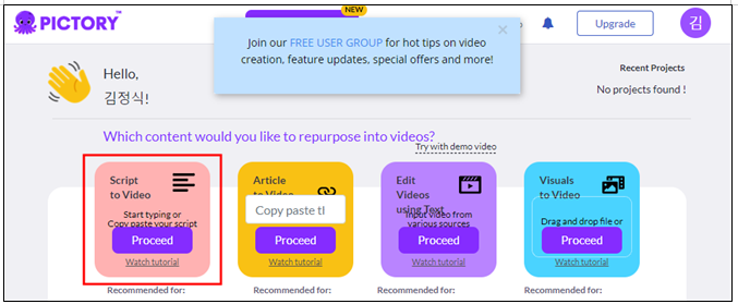 나. 회원가입을 하고 나오는 화면에서 Script to Viedo를 선택한다.