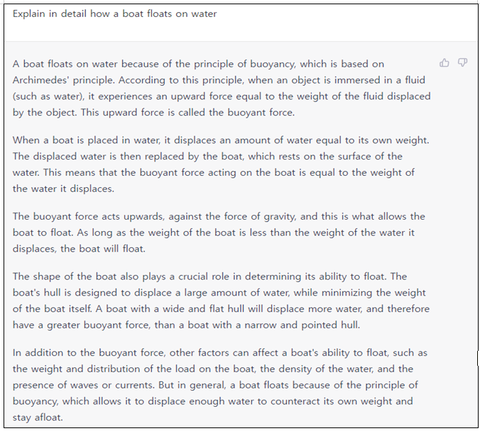 나. 채팅창에 부력에 대해서 자세하게 설명해 달라고 요청한다. 이때 한글로 요청하는 것보다 가능하면 영어로 요청하는 것이 좋다. 왜냐하면 생성형 인공지능이 한글보다 영어를 더 많이 학습했기 때문이다.