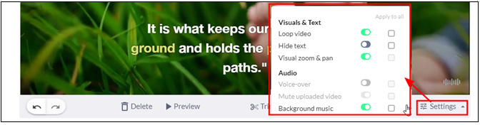 3) 세팅을 눌러 자막이나 배경음악을 추가하거나, 다양한 옵션을 선택할 수 있다.