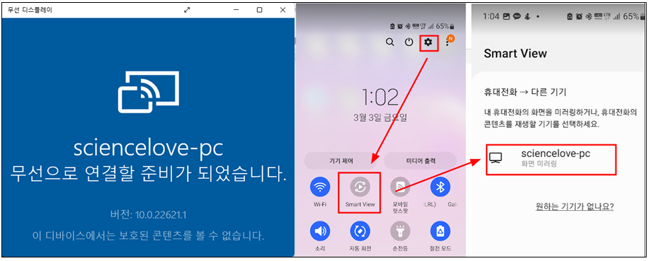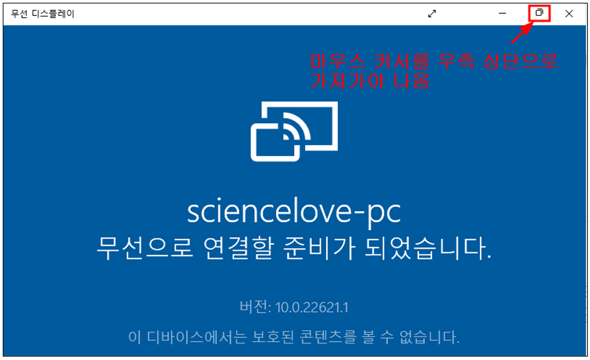 무선디스플레이를 실행 시키면 전체화면으로 실행되는데 그러면 마우스가 작동하지 않는 문제점이 있다. 그래서 무선디스플레이를 실행시키고 스마트기기를 연결하기 전에 마우스를 우측상단으로 가져가서 전체화면 모드에서 창모드로 바꿔 주는 것이 좋다.