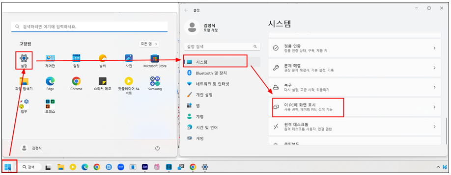 시작(윈도우모양)-설정-시스템-이 PC 화면에 표시 선택