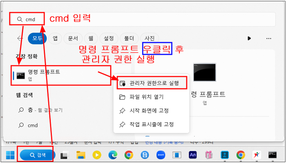 명령 프롬프트를 마우스 우클릭으로 선택하고 관리자 권한으로 실행을 선택