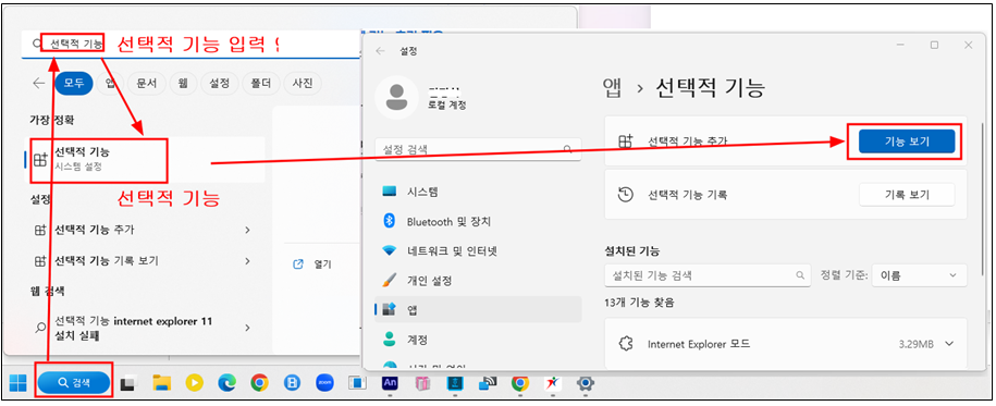 검색창을 누르고 검색어에 ‘선택적 기능’입력