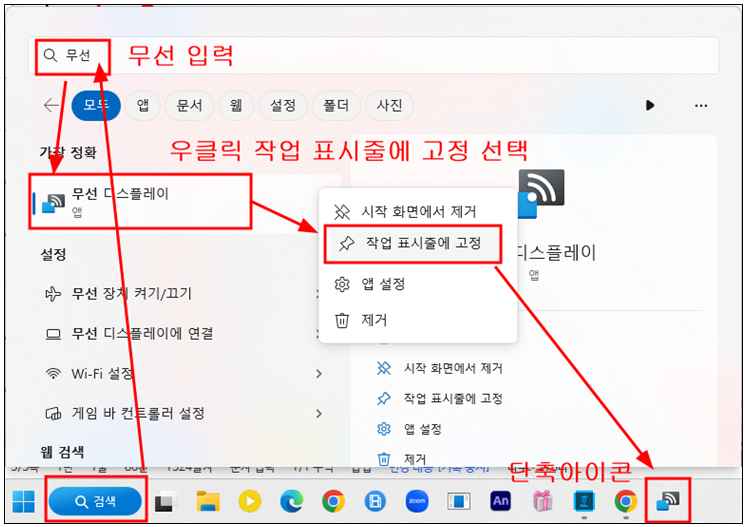 검색창을 선택하고 – 무선 이라고 치면 무선 디스플레이가 나타난다.(위에서 설명한 대로 설치가 되어 있어야 나타난다) 무선 디스플레이 앱을 마우스 오른쪽을 눌러 선택한 다음 작업 표시줄에 고정을 선택하면 작업표시줄에 무선 디스플레이 단축아이콘이 생긴다. 그럼 스마트기기를 미러링 하고 싶을 때 무선 디스플레이 단축아이콘을 누르면 바로 미러링 대기 상태가 된다.