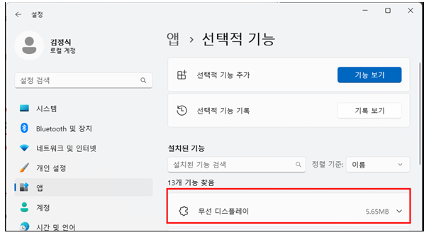 설치가 제대로 되었는지 확인하려면 설정 – 앱 - 선택적 기능에 가서 설치된 기능에 무선 디스플레이가 있는지 확인하면 된다.